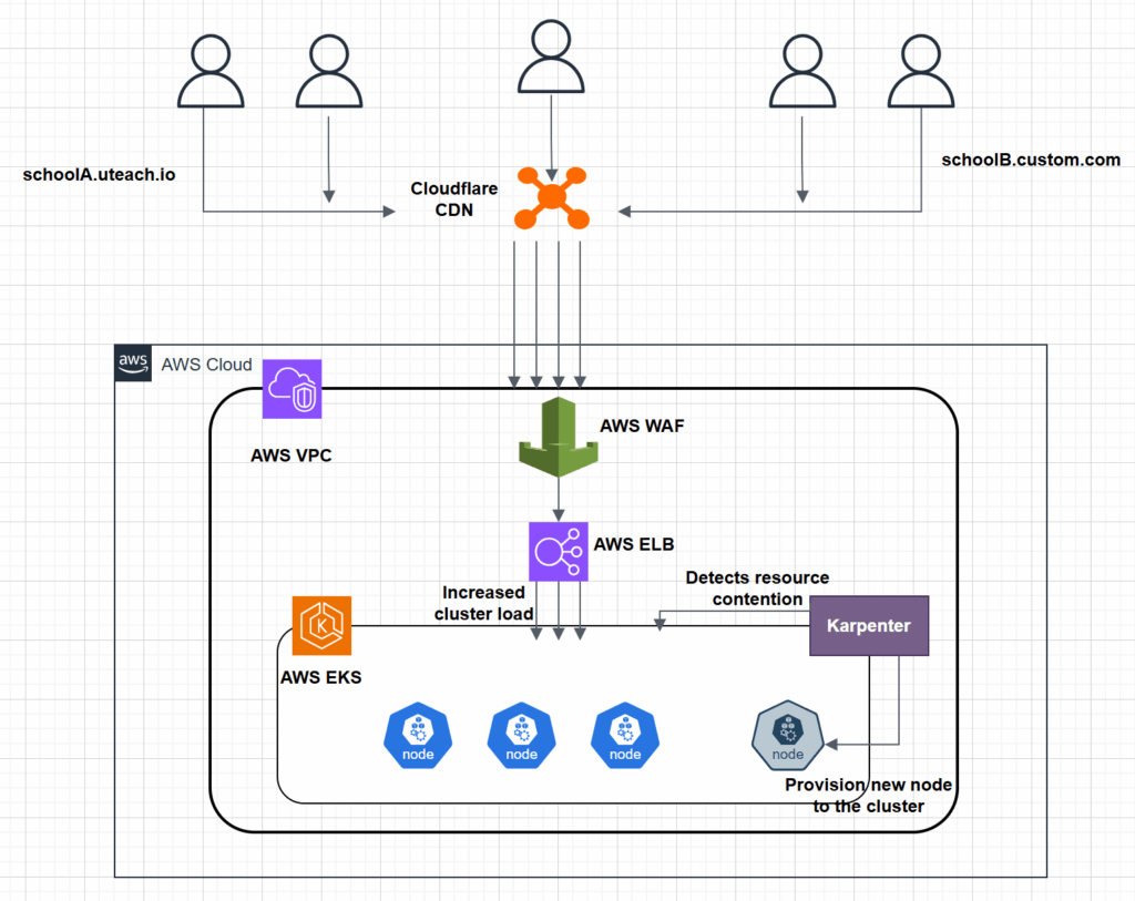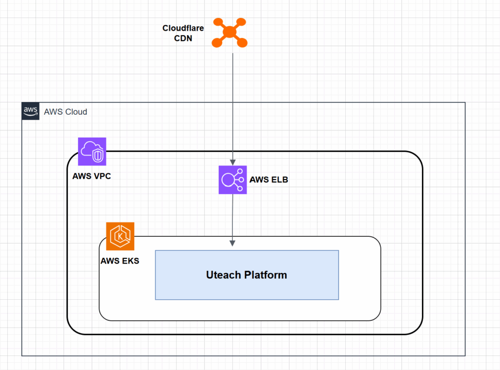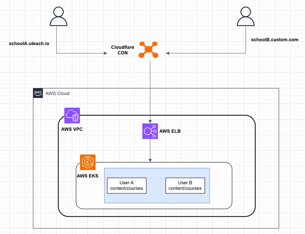 Uteach underlying infrastructure is hosted on AWS. It uses EKS for running the application workloads and ELB for enabling network access. Additionally, they use Cloudflare CDN for caching content on edge locations closer to the users for optimizing performance. Each tenant got their own dns hosted zone in Cloudflare.