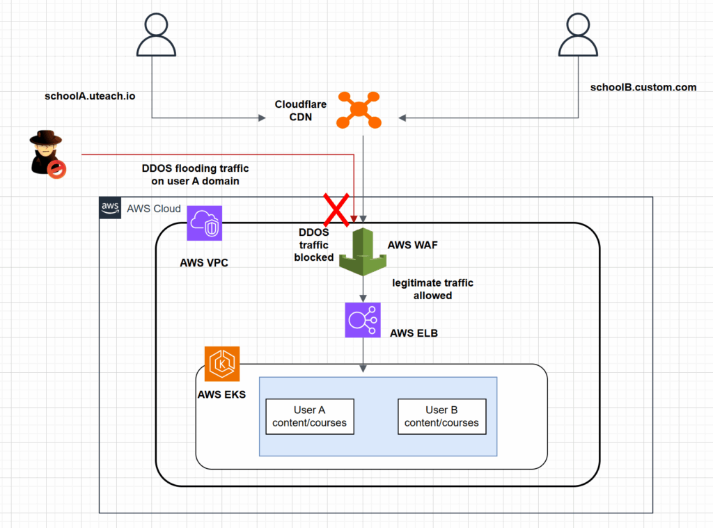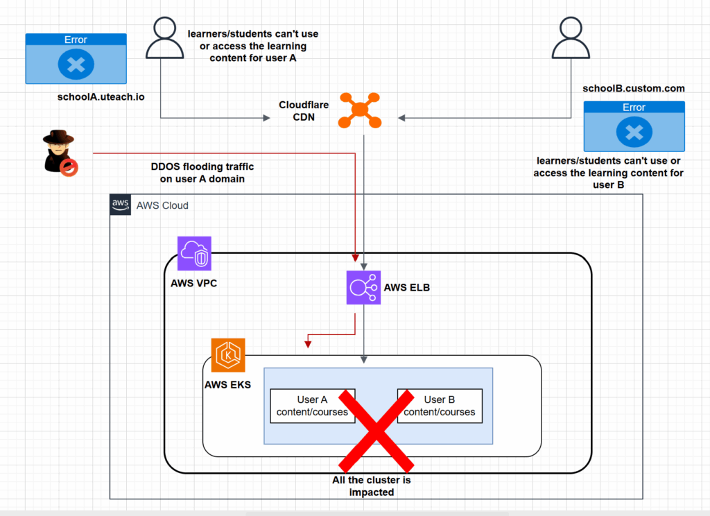 The challenge with this design is that when there’s a resource overload on one of the users, it can impact the whole infrastructure, causing disruptions for all the platform. A recurring scenario that was happening frequently with Uteach is the occurrence of targeted DDoS attacks that overload one of the clients on a specific URL, when this happened, the flooding network traffic was actually hitting the underlying cluster nodes which also host other clients, so all the clients got impacted and experienced the service disruptions.